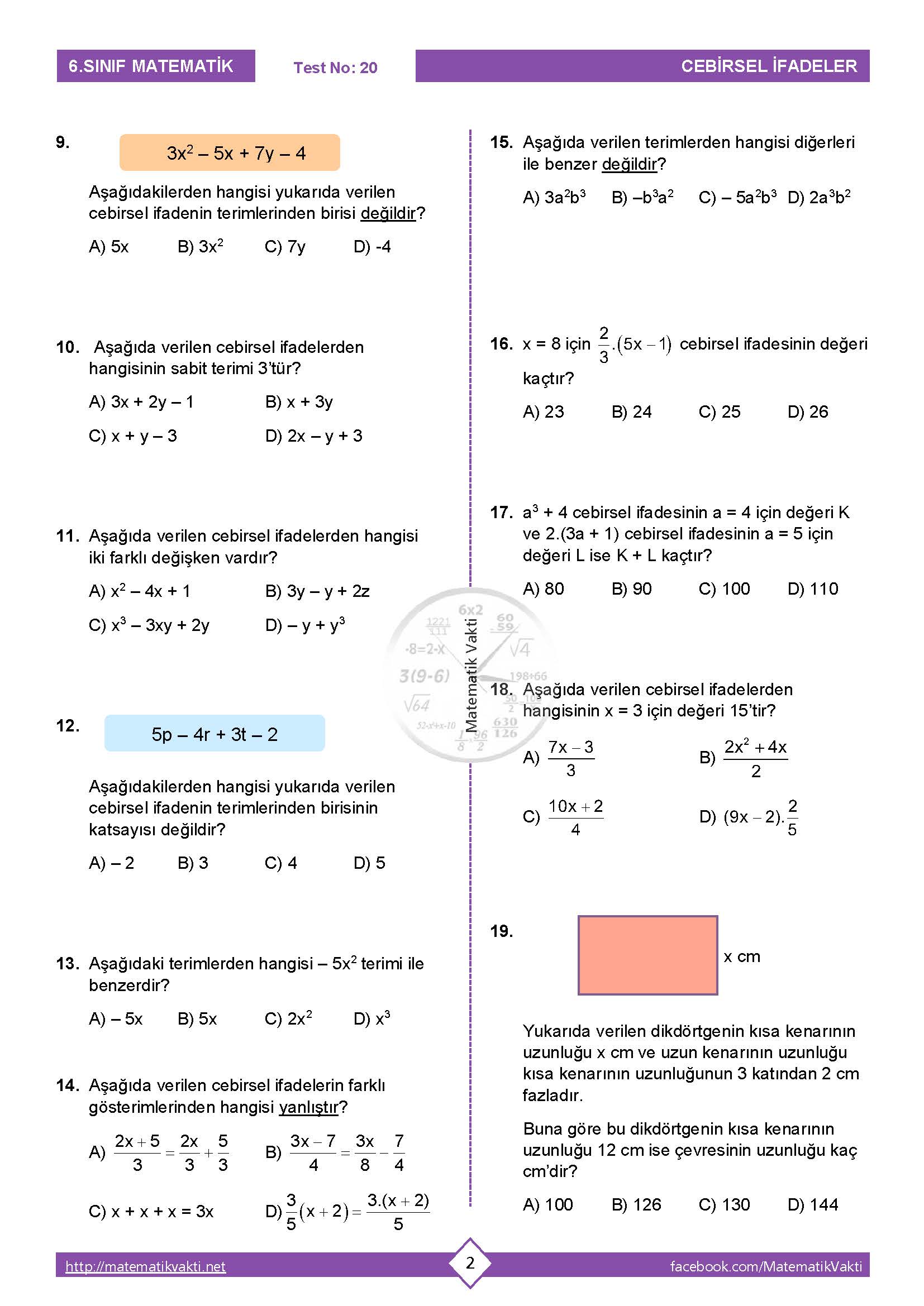 6.sınıf cebirsel ifadeler testi 19 sorudan oluşmakta ve aşağıdaki kazanımlardan sorular içermektedir.