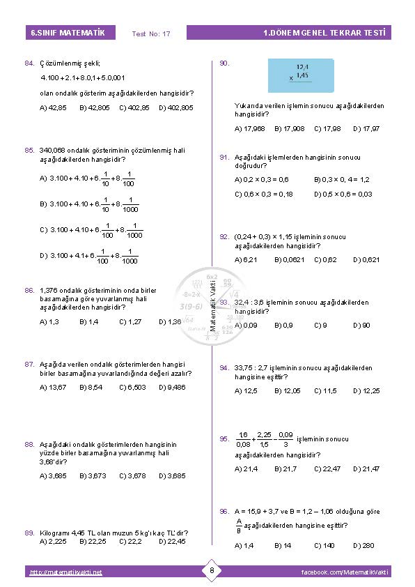 6.sınıf matematik yarıyıl tatil ödevi doğal sayılarla işlemlerden ondalık gösterimlerle çarpma bölme işlemine kadar tüm konuları içeren 96 çoktan seçmeli sorudan oluşmaktadır. 6.sınıf matematik tekrar testinin içeriği kolay, orta ve zor düzeyde sorulardan oluşmaktadır. Tüm 6.sınıf öğrencileri bu testi bilgisayarlarına indirip ve çıktısını alıp çözebilirler.
