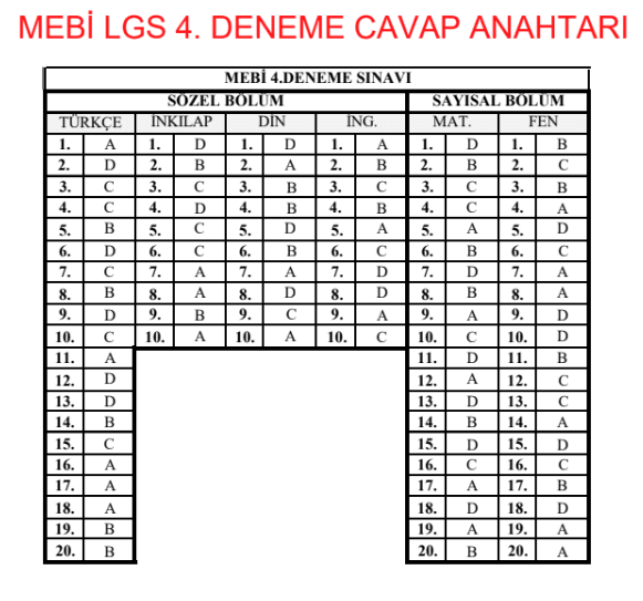 MEBİ LGS Deneme Sınavı 4 pdf dosyasını aşağıdaki Dosya Bilgileri bölümünden olarak indirebilirsiniz. Cevap anahtarı MEB tarafından yayımlandığı anda aşağıdaki bölümünde paylaşılacaktır. Deneme sınavı sonuçlarınıza göre 2026 LGS puanınızı ve yüzdelik diliminizi hesaplamak için web sitemizde bulunan LGS puan hesaplama aracını kullanabilirsiniz. Sınava çevrim içi olarak katılmak isteyen öğrenciler, mebi.eba.gov.tr adresi üzerinden sisteme giriş yaparak online olarak çözebilirler.