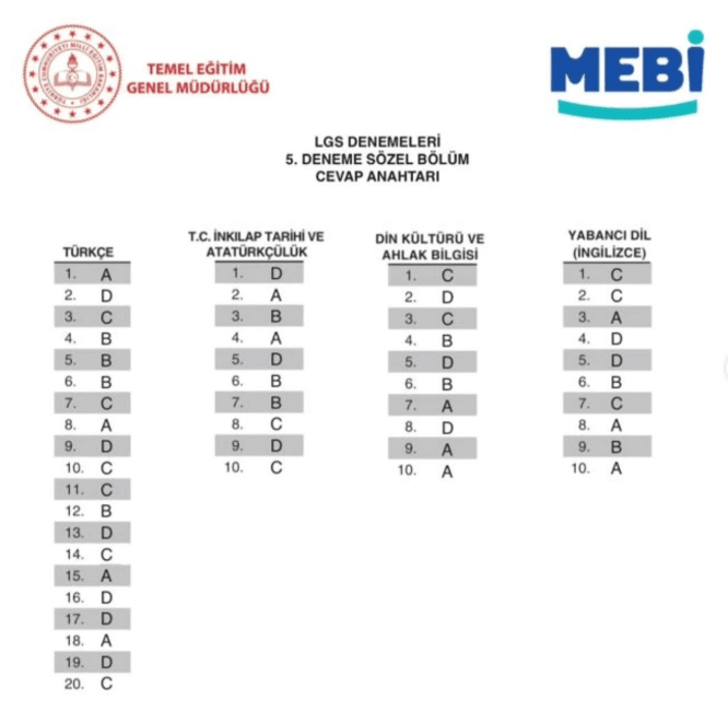 MEBİ LGS Deneme Sınavı 5 ve Cevap Anahtarı (2–8 Mart 2026)